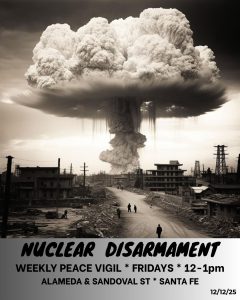 Pro-Peace Vigils occur every Friday from noon to one o’clock at the intersection of Alameda and Sandoval in Santa Fe. This week’s image is below.