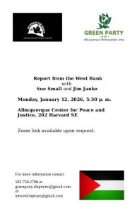 For those in the Las Cruces area, there is an opportunity to hear first-person reporting from a recent trip to the West Bank on November 13, 5pm-7:30pm, in O’Donnell Hall, Room 111, on NMSU campus.